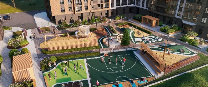 Придомовая территория жилого комплекса LOQO — современное, тщательно спроектированное пространство. Здесь каждый найдет, чем себя занять и как отдохнуть. Воркаут площадка для тренировок на свежем воздухе. Баскетбольная площадка с трибунами – для игроков и их болельщиков Беседки со скамейками и лежаками - тихие, уединенные зоны — идеально для тех, кто работает из дома, хочет сделать паузу и проветрить голову. Игровые площадки для детей всех возрастов.