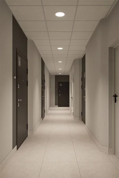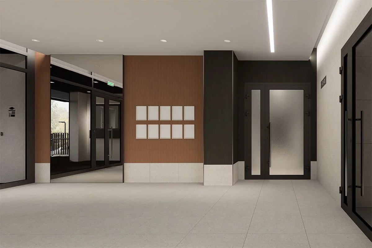 Вход удобный для каждого - полноценный пандус для велосипедистов, мамам с колясками и людей с ограниченными возможностями здоровья. Учитывая климатические условия нашего региона, мы сделали отапливаемый тамбур, где расположен домофон. Предусмотрели помещение для консьержа, колясочную комнату и место для велосипедов – храните вещи там, где им самое место.