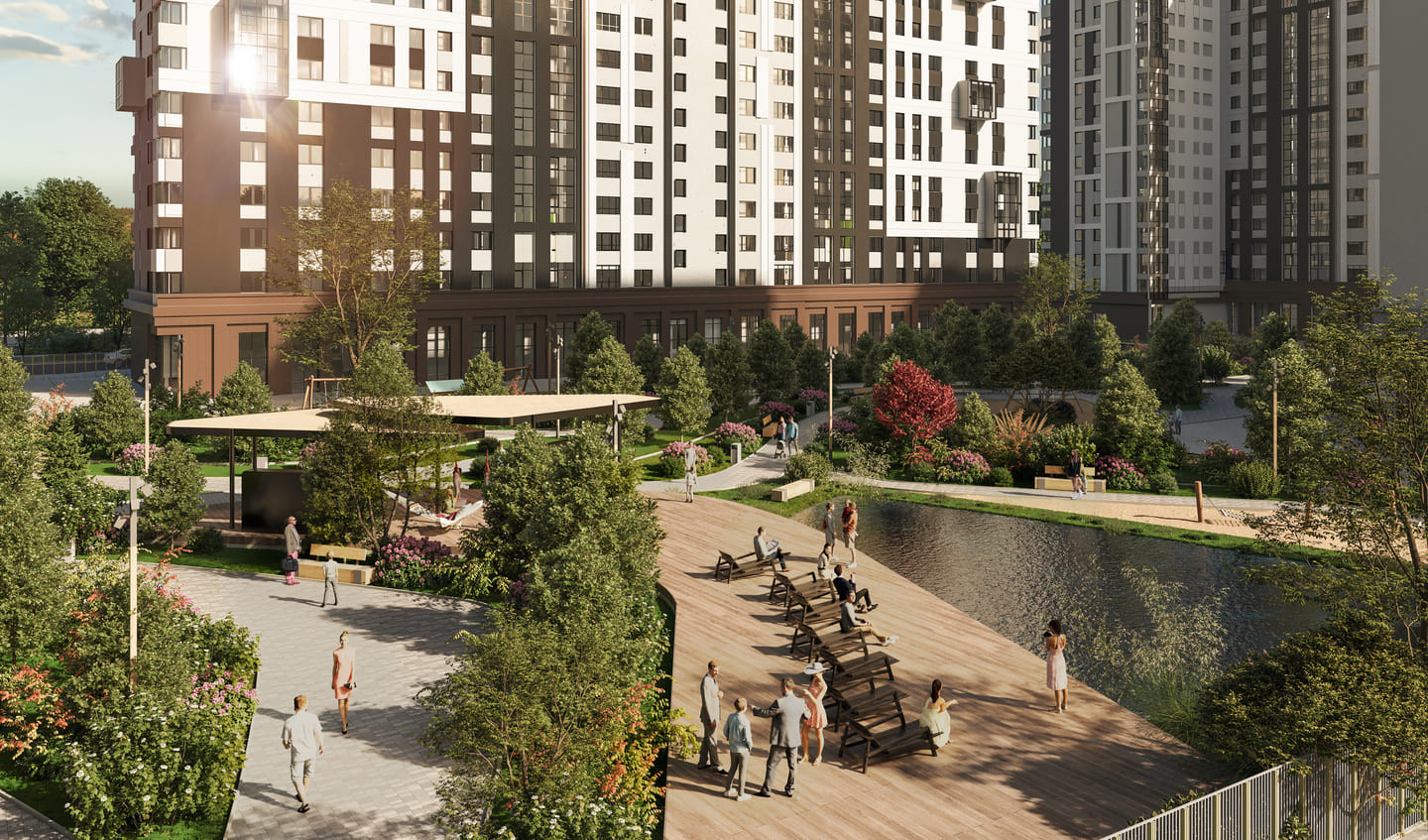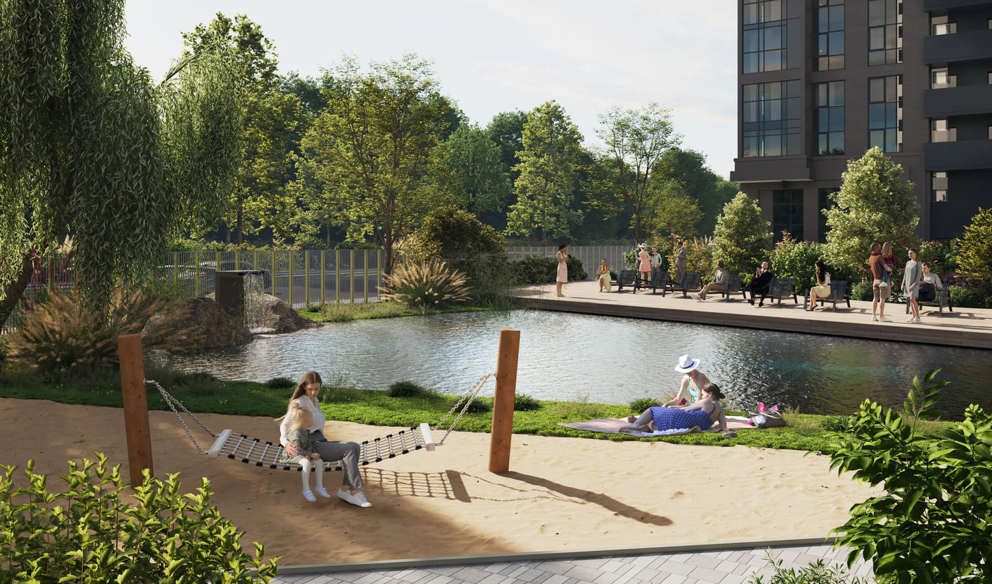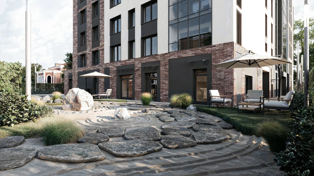 Двор-патио — это настоящий уголок Италии за вашим домом. Здесь есть искусственный водоём, сад камней и уличный кинотеатр. Двор огорожен зелёной изгородью и находится под постоянным видеонаблюдением.