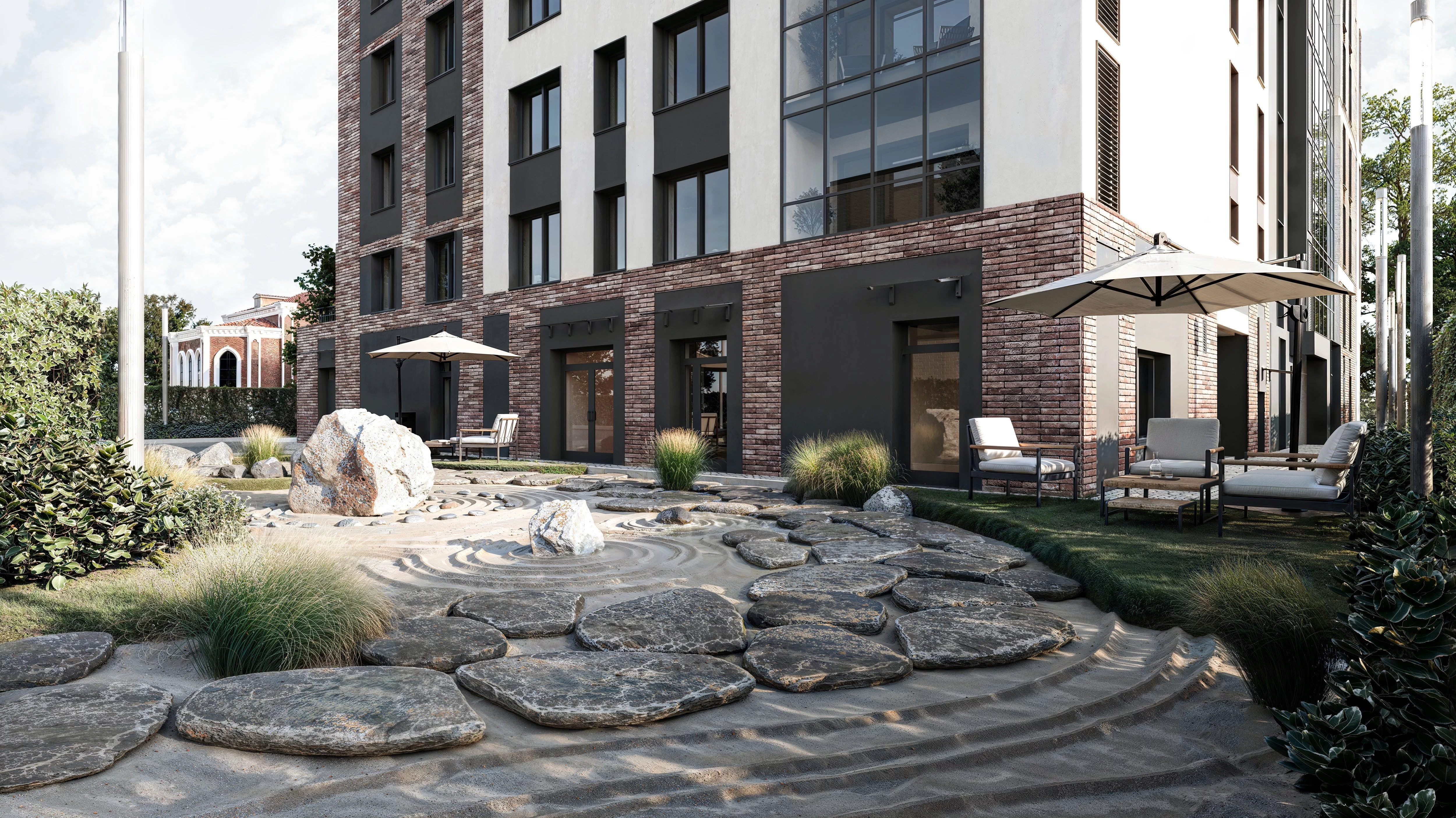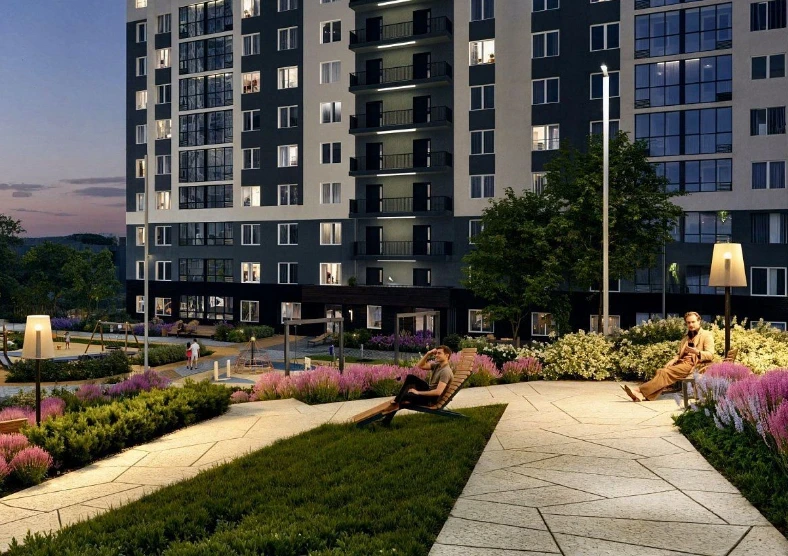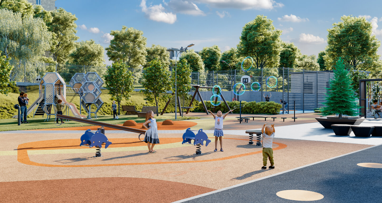 Вдоль дорожек установлены скамейки и фонари, что позволяет наслаждаться вечерними прогулками и отдыхом на свежем воздухе. Прогулочные маршруты продуманы таким образом, чтобы жители могли легко добраться до детских площадок, спортивных зон и мест для отдыха.