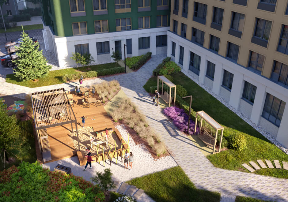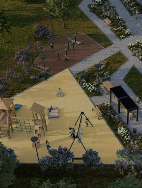 Продуманное пространство для активного и размеренного отдыха. Удобные качели, игровой городок, зона воркаута, места для отдыха и работы на свежем воздухе. Здесь есть всё, чтобы отлично провести время взрослым и детям.