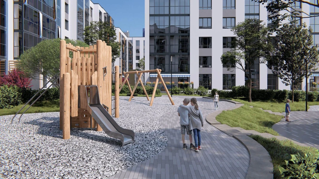 Пространство для малышей с большой песочницей, игровым комплексом и качелями - ваши дети будут с удовольствием проводить время на свежем воздухе.