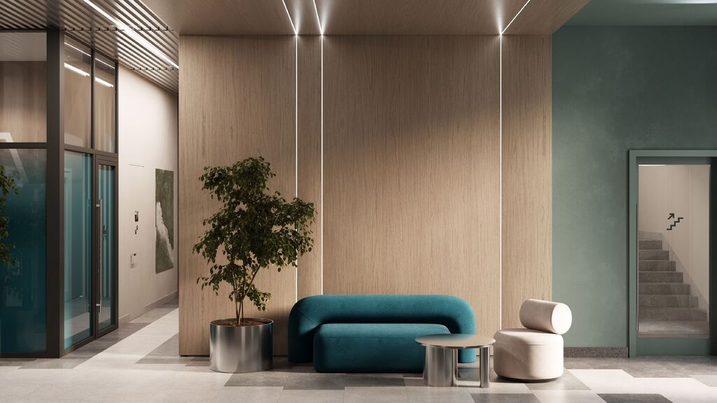 Концепция проекта продолжается интерьером лобби. Здесь преобладают естественные оттенки и текстуры, а мебель выполнена из экологичных материалов. Для удобства жителей созданы собственные колясочные и велосипедные, а для заботы о домашних любимцах предусмотрена лапомойка.