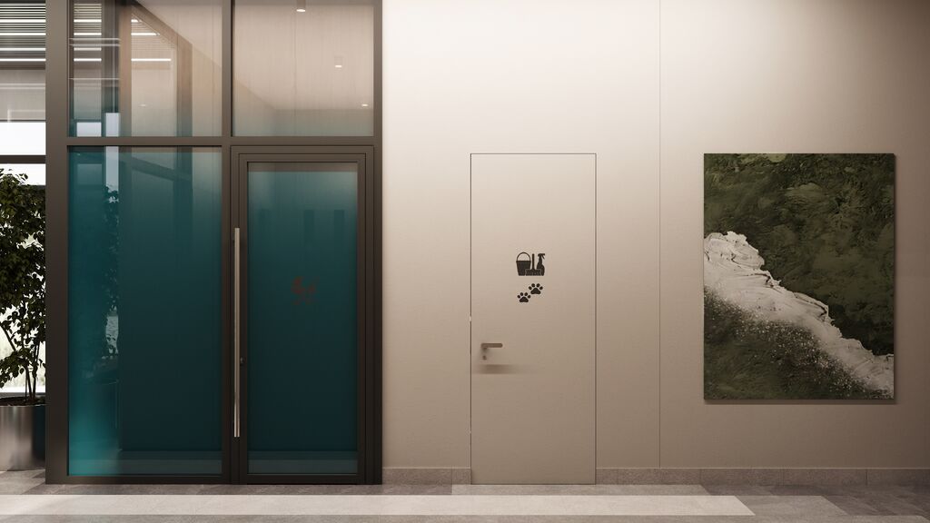 Концепция проекта продолжается интерьером лобби. Здесь преобладают естественные оттенки и текстуры, а мебель выполнена из экологичных материалов. Для удобства жителей созданы собственные колясочные и велосипедные, а для заботы о домашних любимцах предусмотрена лапомойка.