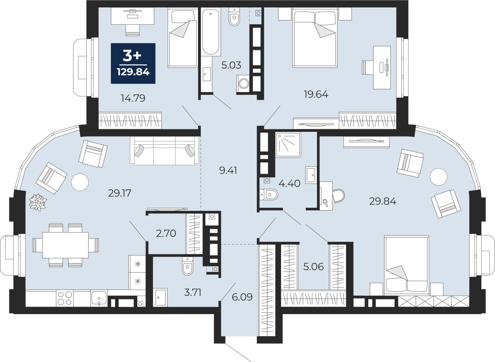 Планировка сочетает большую общественную зону и изолированные комнаты, что делает квартиру удобной для семьи с детьми или тех, кто ценит пространство и функциональность.