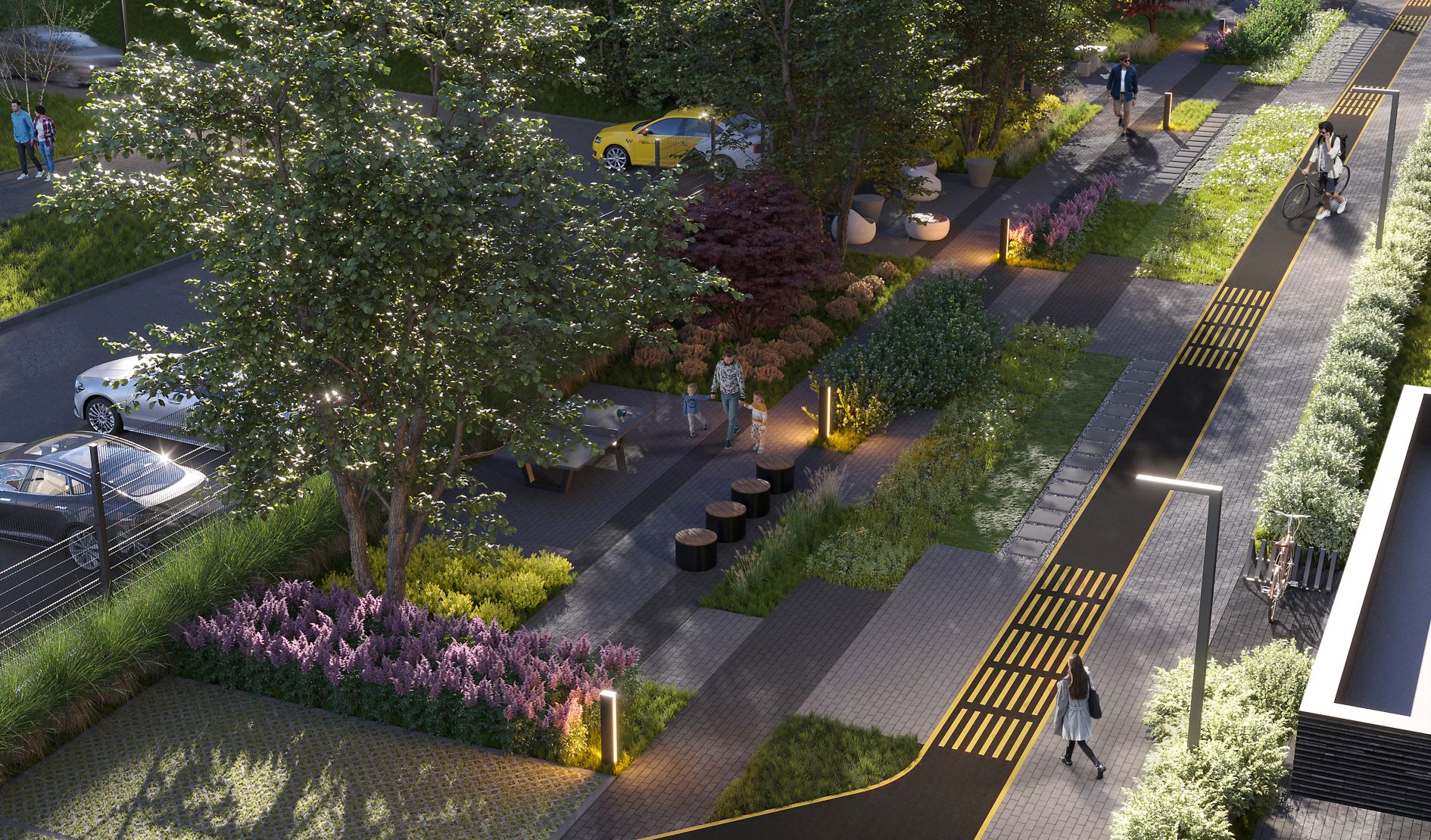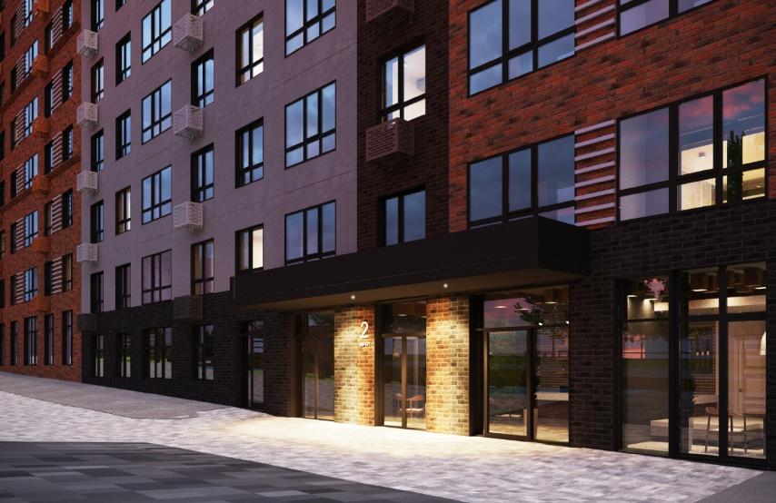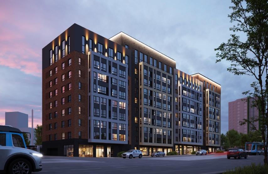 Стильные фасады из кирпича, переменная этажность и архитектурная подсветка задают тон всеми микрорайону.