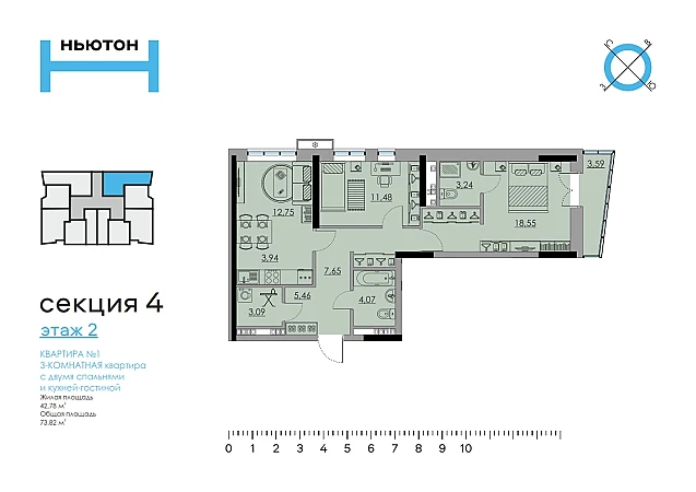 Купить 3к квартиру 73 м² в Ньютон, 4 секция (17 этажей)